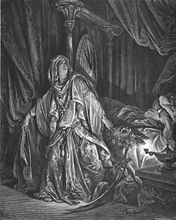Chapter 9 constitutes Judith's "extended prayer",[59] "loudly proclaimed" in advance of her actions in the following chapters. This runs to 14 verses in English versions, 19 verses in the Vulgate.[60]