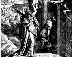 Judith, the protagonist of the book, introduced in chapter 8 as a God-fearing woman, she is the daughter of Merari, a Simeonite,[47] and widow of a certain Manasseh or Manasses, a wealthy farmer. She sends her maid or "waitingwoman"[48] to summon Uzziah so she can challenge his decision to capitulate to the Assyrians if God has not rescued the people of Bethulia within five days, and she uses her charm to become an intimate friend of Holofernes, but beheads him allowing Israel to counter-attack the Assyrians. Judith's maid, not named in the story, remains with her throughout the narrative and is given her freedom as the story ends.[49]