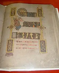 The Abbey of Kells in Kells, County Meath, had been founded, or refounded, from Iona Abbey, construction taking from 807 until the consecration of the church in 814.[9] The manuscript's date and place of production have been subjects of considerable debate. Traditionally, the book was thought to have been created in the time of Columba,[10] possibly even as the work of his own hands. This tradition has long been discredited on palaeographic and stylistic grounds: most evidence points to a composition date c. 800,[11] long after St. Columba's death in 597. The proposed dating in the 9th century coincides with Viking raids on Lindisfarne and Iona, which began c. 793-794 and eventually dispersed the monks and their holy relics into Ireland and Scotland.[12][13] There is another tradition, with some traction among Irish scholars, that suggests the manuscript was created for the 200th anniversary of the saint's death.[14] Alternatively, as is thought possible for the Northumbrian Lindisfarne Gospels and also the St Cuthbert Gospel, both with Saint Cuthbert, it may have been produced to mark the "translation" or moving of Columba's remains into a shrine reliquary, which probably had taken place by the 750s.[15]
