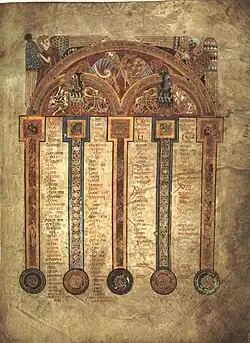 The unity of the Gospels is further emphasised by the decoration of the Eusebian canon tables. The canon tables illustrate the unity of the Gospels by organising corresponding passages from the Gospels. The Eusebian canon tables normally require twelve pages. In the Book of Kells, the makers of the manuscript planned for twelve pages (folios 1v through 7r) but for unknown reasons, condensed them into ten, leaving folios 6v and 7r blank. This condensation rendered the canon tables unusable. The decoration of the first eight pages of the canon tables is heavily influenced by early Gospel Books from the Mediterranean, where it was traditional to enclose the tables within an arcade (as seen in the London Canon Tables).[69] The Kells manuscript presents this motif in an Insular spirit, where the arcades are not seen as architectural elements but rather become stylised geometric patterns with Insular ornamentation. The four evangelist symbols occupy the spaces under and above the arches. The last two canon tables are presented within a grid. This presentation is limited to Insular manuscripts and was first seen in the Book of Durrow.[70]