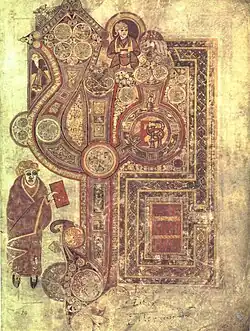 The text is accompanied by many full-page miniature illustrations, while smaller painted decorations appear throughout the text in unprecedented quantities. The decoration of the book is famous for combining intricate detail with bold and energetic compositions. The characteristics of the insular manuscript initial, as described by Carl Nordenfalk, here reach their most extreme realisation: "the initials ... are conceived as elastic forms expanding and contracting with a pulsating rhythm. The kinetic energy of their contours escapes into freely drawn appendices, a spiral line which in turn generates new curvilinear motifs...".[57] The illustrations feature a broad range of colours, with purple, lilac, red, pink, green, and yellow being the colours most often used. Earlier manuscripts tend toward more narrow palettes: the Book of Durrow, for example, uses only four colours. As is usual with insular work, there was no use of gold or silver leaf in the manuscript. The pigments for the illustrations included red and yellow ochre, green copper pigment (sometimes called verdigris), indigo, and possibly lapis lazuli.[58] These would have been imported from the Mediterranean region and, in the case of the lapis lazuli (also known as ultramarine), from northeast Afghanistan.[59][60] Though the presence of lapis lazuli has long been considered evidence of the great cost required to create the manuscript, recent examination of the pigments has shown that lapis lazuli was not used.[58]