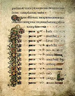 The extant folios of the manuscript start with the fragment of the glossary of Hebrew names. This fragment occupies the left-hand column of folio 1r. A miniature of the four evangelist symbols, now much abraded, occupies the right-hand column. The miniature is oriented so that the volume must be turned ninety degrees to view it properly.[69] The four evangelist symbols are a visual theme that runs throughout the book. They are almost always shown together to emphasise the doctrine of the four Gospels' unity of message.