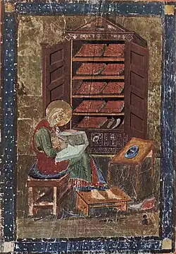 Early medieval bookcase containing about ten codices depicted in the Codex Amiatinus (c. 700)