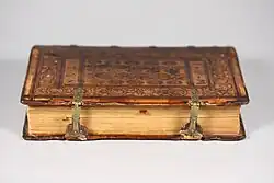 Western books from the fifth century onwards[10] were bound between hard covers, with pages made from parchment folded and sewn onto strong cords or ligaments that were attached to wooden boards and covered with leather. Since early books were exclusively handwritten on handmade materials, sizes and styles varied considerably, and there was no standard of uniformity. Early and medieval codices were bound with flat spines, and it was not until the fifteenth century that books began to have the rounded spines associated with hardcovers today.[11] Because the vellum of early books would react to humidity by swelling, causing the book to take on a characteristic wedge shape, the wooden covers of medieval books were often secured with straps or clasps. These straps, along with metal bosses on the book's covers to keep it raised off the surface that it rests on, are collectively known as furniture.[12]