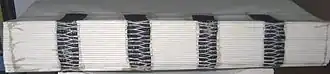Bookbinding in medieval China replaced traditional Chinese writing supports such as bamboo and wooden slips, as well as silk and paper scrolls.[16] The evolution of the codex in China began with folded-leaf pamphlets in the 9th century AD, during the late Tang dynasty (618–907), improved by the 'butterfly' bindings of the Song dynasty (960–1279), the wrapped back binding of the Yuan dynasty (1271–1368), the stitched binding of the Ming (1368–1644) and Qing dynasties (1644–1912), and finally the adoption of Western-style bookbinding in the 20th century (coupled with the European printing press that replaced traditional Chinese printing methods).[17] The initial phase of this evolution, the accordion-folded palm-leaf-style book, most likely came from India and was introduced to China via Buddhist missionaries and scriptures.[17]