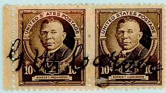 In 1896 when Washington reviewed the study conducted by George Washington Carver about the infection plaguing the soybean crop he invited Carver to head the Agriculture Department at Tuskegee, where they became close friends.[20] Carver later autographed commemorative stamps issued in 1940 in Washington's honor.