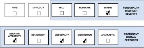 Classification of personality disorders differs significantly between the two most prominent frameworks for classification of mental disorders, namely: the Diagnostic and Statistical Manual of Mental Disorders and the International Classification of Diseases, the most recent editions of which are the DSM-5-TR and ICD-11, respectively. While personality disorders, including BPD, are diagnosed as separate entities in the DSM-5; in the ICD-11 classification of personality disorders, they are assessed in terms of severity levels, with trait and pattern specifiers serving to characterize the particular style of pathology.[101] There is also a hybrid model,[102] called the Alternative DSM-5 model for personality disorders, which defines BPD and five other PDs through disorder-specific combinations of pathological traits and areas of overall impairment.[101]