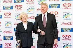 Boris Becker was born in 1967 in Leimen, a town in the German state of Baden-Württemberg, the son of Elvira and Karl-Heinz Becker. Named after the Russian poet and novelist Boris Pasternak,[17] young Becker was raised Catholic.[18] His father Karl-Heinz, an architect, founded a tennis centre in Leimen, where Becker learned to play tennis. He received his secondary education at Helmholtz-Gymnasium in Heidelberg.[19] His Sudeten German mother Elvira Becker, née Pisch was from the Moravian village of Kunewald (Kunín).