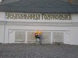 Boris left one son, Feodor II, who succeeded him but only ruled Russia for less than a month, until he and Boris's widow were murdered by the enemies of the Godunovs in Moscow on 10/20 June 1605.[26] Boris's first son, Ivan, was born in 1587 and died in 1588. His daughter, Xenia, was born in 1582. She was engaged to Johann of Schleswig-Holstein, but he died shortly before their planned wedding in October 1602. Xenia was given the name "Olga" upon being forced to take monastic vows at the Voskresensky Monastery in Beloozero and her name is inscribed as "the Nun Olga Borisovna" at the crypt of the Godunovs at the Trinity Lavra of St. Sergius where she lived from 1606, when she sojourned there to attend the reburial of her father, until her death in 1622.[27] Boris, his wife, and their children are buried together in a mausoleum near the entrance of the Assumption Cathedral at Trinity–St. Sergius Lavra.
