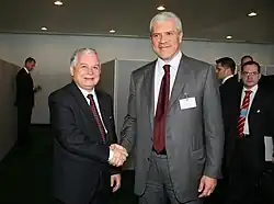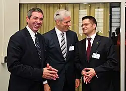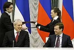 Tadić said that he was ready, authorised as per Vienna Convention,[56] to sign the Stabilisation and Association Agreement (SAA) with the European Union if it were offered on 28 April, but not at the price of recognising Kosovo's unilaterally declared independence.[57] Tadić attended the signing of the SAA ceremony in Luxembourg on 29 April, where the Deputy Prime Minister Božidar Đelić signed the document on behalf of Serbia, as per the authorisation of the Government from December 2007. He was opposed by the then Prime Minister Vojislav Koštunica who believed that Serbia ought not to sign any agreements with the European Union.[58] While, on 1 May, Koštunica said that Russian Foreign Minister Sergei Lavrov was right when he said that the SAA should have been signed, he nonetheless vowed to annul the agreement after the parliamentary elections, calling it "not in the service of Serbia's territorial integrity."[59][60]