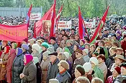 Between 1988 and 1991, Yeltsin established himself as the hero of the anti-communist opposition in the Soviet Union.[97] On 26 March 1989, Yeltsin was elected to the Congress of People's Deputies of the Soviet Union as the delegate from Moscow district with a decisive 92% of the vote,[82] and on 29 May 1989, he was elected by the Congress of People's Deputies to a seat on the Supreme Soviet of the Soviet Union. On 19 July 1989, Yeltsin announced the formation of the radical pro-reform faction in the Congress of People's Deputies, the Inter-Regional Group of Deputies, and on 29 July 1989 was elected one of the five co-chairmen of the Inter-Regional Group.[82] Following these victories, Yeltsin had become a charismatic leader with legendary and almost mythical authority both at home and abroad and earned a reputation of an anti-communist revolutionary.[97]
