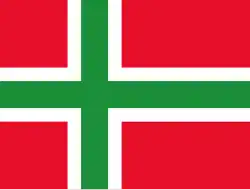 Unofficial flag of Bornholm. The Dannebrog is clearly visible with the green cross inserted in the white cross.