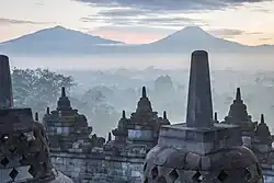 Hindu clerics appealed to the people of Java for generations, a fact that architect and author Jacques Dumarçay finds first mentioned in 450 AD.[25] Influence of the Sailendra and Sanjaya dynasties followed. Dumarçay says that de Casparis concluded that Sanjaya and Sailendra shared power in central Java for a century and a half, and that de Casparis traced alternating succession from 732 until 882.[26] During this time many Hindu and Buddhist monuments were built on the plains and mountains around the Kedu Plain. Buddhist monuments, including Borobudur, were erected around the same period as the Hindu Prambanan temple compound. In 732 AD, King Sanjaya commissioned a Shivalinga sanctuary to be built on the Wukir hill, only 10 km (6.2 mi) east of Borobudur.[27]