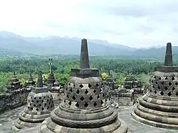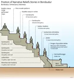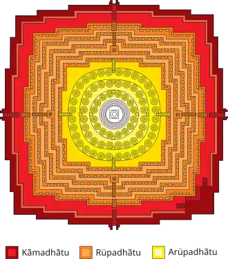 Many sources conventionally divide the terraces of Borobudur into three levels, which is thought to symbolize the three "realms" of Buddhist cosmology, namely Kamadhatu (the world of desires), Rupadhatu (the world of forms), and finally Arupadhatu (the formless world).[94] Kāmadhātu is represented by the base, Rupadhatu by the five square platforms (the body), and Arupadhatu by the three circular platforms and the large topmost stupa.[95] Recent scholarship however question this assumption. The "three realm" division was first proposed by Willem Frederik Stutterheim in the early 20th century based on then very fragmentary data. Later scholars have criticized this division as having no textual basis or narrative support in the monument itself.[96] However, this conventional division is still often presented uncritically in popular media.