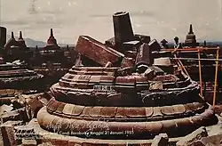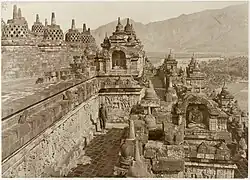 In 1882, the chief inspector of cultural artifacts recommended that Borobudur be entirely disassembled with the relocation of reliefs into museums due to the unstable condition of the monument.[44] As a result, the government appointed Willem Pieter Groeneveldt, curator of the archaeological collection of the Batavian Society of Arts and Sciences, to undertake a thorough investigation of the site and to assess the actual condition of the complex; his report found that these fears were unjustified and recommended it be left intact.[45]