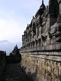 Borobudur is constructed in such a way that it reveals various levels of terraces, showing intricate architecture that goes from being heavily ornamented with bas-reliefs to being plain in Arupadhatu circular terraces.[111] The first four terrace walls are showcases for bas-relief sculptures. These are considered to be among the finest works of art in the Buddhist world.[112]