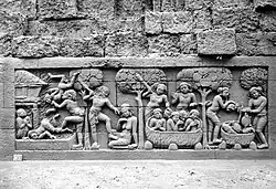 In 1885, a hidden structure at the base was accidentally discovered.[98] The "hidden footing" contains complete and incomplete panel reliefs, 160 of which depict narratives concerning cause and effects according to the dharmic laws. There also panels with short inscriptions that apparently provide instructions for the sculptors, illustrating the scenes to be carved.[99] The partly finished nature of the reliefs suggest that were initially planned, but they were later encased due to circumstances which is still debated among scholars. A practical explanation concerns structural defects that became apparent when the monument was under construction. Possibly fearing a subsidence that may cause the whole structure to slide outward, work on the partly sculpted foot was suspended and it was encased with an additional base for stability.[99] Scholars have also proposed various religious or symbolic grounds which may caused the builders and commissioners of Borobudur to abandon the relief works and encased it from view.[98][100]