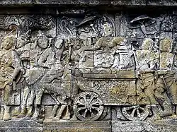 The bas-reliefs in Borobudur depicted many scenes of daily life in 8th-century ancient Java,[113][114] from the courtly palace life, hermit in the forest, to those of commoners in the village. It also depicted temple, marketplace, various flora and fauna, and also native vernacular architecture. People depicted here are the images of king, queen, princes, noblemen, courtier, soldier, servant, commoners, priest and hermit. The reliefs also depicted spiritual beings in Buddhism such as asuras, gods, bodhisattvas, kinnaras, gandharvas and apsaras. The images depicted on bas-relief often served as reference for historians to research for certain subjects, such as the study of architecture, weaponry, economy, fashion, and also mode of transportation of 8th-century Maritime Southeast Asia. One of the famous renderings of an 8th-century Southeast Asian double outrigger ship is Borobudur Ship.[115] Today, the actual-size replica of Borobudur Ship that had sailed from Indonesia to Africa in 2004 is displayed in the Samudra Raksa Museum, located a few hundred meters north of Borobudur.[116]