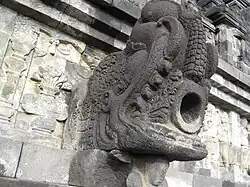 The main structure can be divided into three components: base, body, and top.[107] The base is 123 m × 123 m (404 ft × 404 ft) in size with 4 metres (13 ft) walls.[102] The body is composed of five square platforms, each of diminishing height. The first terrace is set back 7 metres (23 ft) from the edge of the base. Each subsequent terrace is set back 2 metres (6.6 ft), leaving a narrow corridor at each stage. The top consists of three circular platforms, with each stage supporting a row of perforated stupas, arranged in concentric circles. There is one main dome at the center, the top of which is the highest point of the monument, 35 metres (115 ft) above ground level. Stairways at the center of each of the four sides give access to the top, with a number of arched gates overlooked by 32 lion statues. The gates are adorned with Kala's head carved on top of each and Makaras projecting from each side.[110] This Kala-Makara motif is commonly found on the gates of Javanese temples. The main entrance is on the eastern side, the location of the first narrative reliefs. Stairways on the slopes of the hill also link the monument to the low-lying plain.
