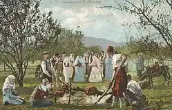 1895 painting of Bosniaks roasting a lamb and dancing the kolo