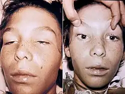 | A 14-year-old boy with botulism, characterised by weakness of the eye muscles and the drooping eyelids shown in the left image, and dilated and non-moving pupils shown in the right image. This person was fully conscious. | |