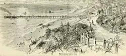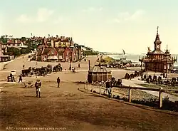 At a time when the most convenient way to arrive in the town was by sea, a pier was considered to be a necessity. The Holdenhurst parish vestry was reluctant to find the money, and an attempt to raise funds privately in 1847 only succeeded in financing a small 100-foot (30 m) jetty.[34] The Bournemouth Improvement Act 1856 (19 & 20 Vict. c. xc) granted greater financial autonomy to the town and a pier was approved that year. A number of wooden structures were built before an 838 feet (255 m) cast iron design by Eugenius Birch was completed in 1880.[34][35] Under the Act, a board of 13 Commissioners was established to build and organise the expanding infrastructure of the town, such as paving, sewers, drainage, street lighting and street cleaning.[36]
