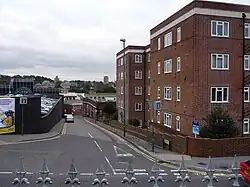 The Bournemouth Blitz saw heavy damage to the town during the Second World War despite initially escaping heavy bombing. A raid by German fighter bombers on 23 May 1943 killed 131 people and damaged 3,359 buildings, with two large hotels being completely destroyed. It is believed that the large number of RAF airmen billeted in the town may have been the reason for the attack.[38] The seafront incurred damage when it was fortified against invasion.[39] The cast iron lampposts and benches along the beach were removed and melted down for munitions, as was much of the superstructure from both Bournemouth and Boscombe piers, before they were breached to prevent their use by enemy ships.[39] The large amounts of barbed wire and anti-tank obstacles along the beach, and the mines at the foot of the chines, took two years to remove when peace was achieved.[40]