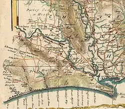 In the 12th century, the region around the mouth of the River Bourne was part of the Hundred of Holdenhurst. The hundred later became the Liberty of Westover when it was extended to include the settlements of North Ashley, Muscliff, Muccleshell, Throop, Iford, Pokesdown, Tuckton and Wick, and incorporated into the Manor of Christchurch.[15] Although the Dorset and Hampshire region surrounding it had been the site of human settlement for thousands of years, Westover was largely a remote and barren heathland before 1800.[16] In 1574, the Earl of Southampton said that the area was "Devoid of all habitation". As late as 1795, the Duke of Rutland recorded that "... on this barren and uncultivated heath there was not a human to direct us".[4][17]