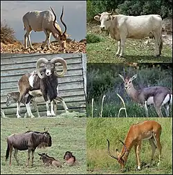 | Example Bovidae (clockwise from top left) – addax (Addax nasomaculatus), domestic cattle (Bos taurus), mountain gazelle (Gazella gazella), impala (Aepyceros melampus), blue wildebeest (Connochaetes taurinus), and mouflons (Ovis gmelini) | |