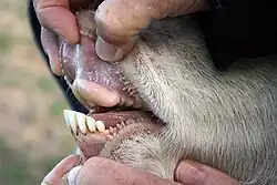Most bovids bear 30 to 32 teeth.[32] While the upper incisors are absent, the upper canines are either reduced or absent. Instead of the upper incisors, bovids have a thick and tough layer of tissue, called the dental pad, that provides a surface to grip grasses and foliage. They are hypsodont and selenodont, since the molars and premolars are low-crowned and crescent-shaped cusps. The lower incisors and canines project forward. The incisors are followed by a long toothless gap, known as the diastema.[49] The general dental formula for bovids is 0.0.2-3.33.1.3.3. Most members of the family are herbivorous, but most duikers are omnivorous. Like other ruminants, bovids have four-chambered stomachs, which allow them to digest plant material, such as grass, that cannot be used by many other animals. Ruminants (and some others like kangaroos, rabbits, and termites) are able to use micro-organisms living in their guts to break down cellulose by fermentation.[3]