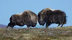 In the mating season, rutting males bellow to make their presence known to females. Muskoxen roar during male-male fights, and male saigas force air through their noses, producing a roar to deter rival males and attract females. Mothers also use vocal communication to locate their calves if they get separated. During fights over dominance, males tend to display themselves in an erect posture with a level muzzle.[55][56]