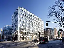 The vagrant population of the Bowery declined after the 1970s, in part because of the city's effort to disperse it.[3] Since the 1990s the entire Lower East Side has been reviving, and gentrification has contributed to ongoing change along the Bowery. In particular, the number of high-rise condominiums is growing.[30] In 2007, the SANAA-designed facility for the New Museum of Contemporary Art opened between Stanton and Prince Street.[31] In 2008, AvalonBay Communities opened Avalon Bowery Place, its first luxury apartment complex on the Bowery; the structure includes a Whole Foods Market. Avalon Bowery Place was quickly followed with the development of Avalon Bowery Place II.[30]