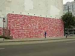 The mural series was initiated from March to December 2008 with a tribute to Keith Haring’s noted 1982 Bowery mural. This was followed by a mural by the Brazilian twin-brother duo Os Gêmeos, which they dedicated to artist Dash Snow, who had recently died from a drug overdose; this was presented from July 2009 to March 2010. The next mural, by Shepard Fairey, was on exhibit from April through August 2010, and was followed by a mural by Barry McGee which celebrated the role of graffiti tagging in the history of New York City street art; it was on display from August to November 2010. This was followed by a tribute to Dash Snow by Irak, which ran from November 24–26, 2010.[46] Other artists to have murals presented include the twins How & Nosm (2012), Crash (2013), Martha Cooper (2013), Revok and Pose (2013), Swoon (2014), and Maya Hayuk.[47][48]