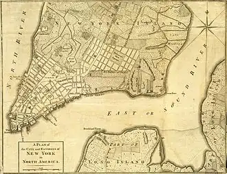 The Bowery (unmarked), leading to the "Road to Kings Bridge, where the Rebels mean to make a Stand" in a British map of 1776
