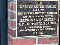 In October 2011, a Bowery Historic District was registered with the New York State Register of Historic Places and therefore was automatically nominated for listing on the National Register of Historic Places. A grassroots community organization named Bowery Alliance of Neighbors (BAN) in association with the community-based housing organization called the Two Bridges Neighborhood Council led the effort for creation of the historic district. The designation means that property owners will have financial incentives to restore rather than demolish old buildings on the Bowery.[37] BAN was recognized for its preservation efforts with a Village Award from the Greenwich Village Society for Historic Preservation in 2013.[38] The historic district runs from Chatham Square to Astor Place on both sides of the Bowery.[36]