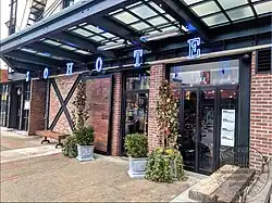 From 1878 to 1955 the Third Avenue El ran above the Bowery, further darkening its streets, populated largely by men. "It is filled with employment agencies, cheap clothing and knickknack stores, cheap moving-picture shows, cheap lodging-houses, cheap eating-houses, cheap saloons", writers in The Century Magazine found it in 1919. "Here, too, by the thousands come sailors on shore leave, – notice the 'studios' of the tattoo artists, – and here most in evidence are the 'down and outs'".[22] Prohibition eliminated the Bowery's numerous saloons: One Mile House, the "stately old tavern... replaced by a cheap saloon"[23] at the southeast corner of Rivington Street, named for the battered milestone across the way,[24] where the politicians of the East Side had made informal arrangements for the city's governance,[25][26] was renovated for retail space in 1921, "obliterating all vestiges of its former appearance", The New York Times reported. Restaurant supply stores were among the businesses that had come to the Bowery,[27] and many remain to this day.