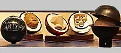 Balls were made using the husks of grains, covered in a material such as leather, and bound with string. Other balls made of porcelain have also been found, indicating that these were rolled along the ground rather than thrown due to their size and weight.[6] Some of these resemble the modern-day jack used in target bowl games. Bowling games of different forms are also noted by Herodotus as an invention of the Lydians in Asia Minor.[7]