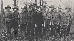 In 1907, Robert Baden-Powell founded the Scouting movement in England using elements of Seton's works among other influences.[11] In 1909, Chicago publisher W. D. Boyce was visiting London, where he encountered a boy who came to be known as the Unknown Scout.[12] Boyce was lost on a foggy street when an unknown Scout came to his aid, guiding him to his destination. The boy then refused Boyce's tip, explaining that he was a Boy Scout and was merely doing his daily good turn. Interested in the Boy Scouts, Boyce met with staff at the Boy Scouts Headquarters and, by some accounts, Baden-Powell. Upon his return to the US, Boyce was inspired by his experience and incorporated the Boy Scouts of America on February 8, 1910.[13] Edgar M. Robinson and Lee F. Hanmer became interested in the nascent BSA and convinced Boyce to turn the program over to the YMCA for development in April 1910. Robinson enlisted Seton, Beard, Charles Eastman, and other prominent leaders in the early youth movements. Former president Theodore Roosevelt, who had long complained of the decline in American manhood, became an ardent supporter.[14] In January 1911, Robinson turned the movement over to James E. West who became the first Chief Scout Executive and Scouting began to expand in the US[9]: 148 Among other programs in the US, the Woodcraft Indians and Sons of Daniel Boone, eventually merged with the BSA.[15]: 52