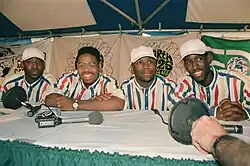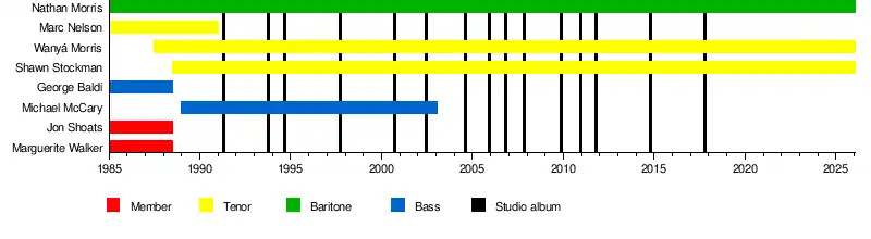 Boyz II Men[a] is an American vocal harmony group from Philadelphia, Pennsylvania, best known for emotional ballads and a cappella harmonies. Formed in 1985, they have been a trio composed of baritone Nathan Morris, tenor Wanyá Morris, and tenor Shawn Stockman since 2003. During the 1990s, Boyz II Men was a quartet with bass singer Michael McCary, who left the group in 2003 due to health issues after being diagnosed with multiple sclerosis.[2]
