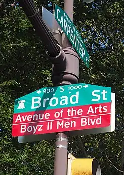 On June 24, 2017, a section of Broad Street in Philadelphia, from Christian to Carpenter Streets, was renamed “Boyz II Men Boulevard” by the city council. Philadelphia High School for the Creative and Performing Arts, where the members of Boyz II Men were once students, is on this section of Broad Street.[25]