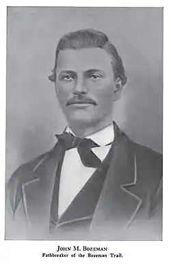 John Bozeman, with Daniel Rouse and William Beall, platted the town in August 1864, stating "standing right in the gate of the mountains ready to swallow up all tenderfeet that would reach the territory from the east, with their golden fleeces to be taken care of."[12] Red Cloud's War closed the Bozeman Trail in 1868, but the town's fertile land still attracted permanent settlers.