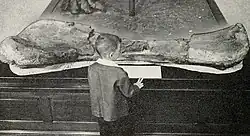 The site, Riggs Quarry 13, is located on a small hill later known as Riggs Hill; it is today marked by a plaque. More Brachiosaurus fossils are reported on Riggs Hill, but other fossil finds on the hill have been vandalized.[8][10] During excavation of the specimen, Riggs misidentified the humerus as a deformed femur due to its great length, and this seemed to be confirmed when an equally-sized, well-preserved real femur of the same skeleton was discovered. In 1904 Riggs noted: "Had it not been for the unusual size of the ribs found associated with it, the specimen would have been discarded as an Apatosaur, too poorly preserved to be of value." It was only after preparation of the fossil material in the laboratory that the bone was recognized as a humerus.[11] The excavation attracted large numbers of visitors, delaying the work and forcing Menke to guard the site to prevent bones from being looted. On August 17, the last bone was jacketed in plaster.[12] After a concluding ten-day prospecting trip, the expedition returned to Grand Junction and hired a team and wagon to transport all fossils to the railway station, during five days; another week was spent to pack them in thirty-eight crates with a weight of 5,700 kilograms (12,500 lb).[13] On September 10, Riggs left for Chicago by train, arriving on the 15th; the railroad companies let both passengers and cargo travel for free, as a public relations gesture.[14]