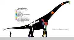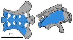 B. nougaredi was in 2004 considered to represent a distinct, unnamed brachiosaurid genus,[52] but a 2013 analysis by Philip D. Mannion and colleagues found that the remains possibly belong to more than one species, as they were collected far apart.[50] The metacarpals were concluded to belong to some indeterminate titanosauriform. The sacrum was reported lost in 2013. It was not analyzed and provisionally considered to represent an indeterminate sauropod, until such time that it could be relocated in the collections of the Muséum national d'histoire naturelle. Only four out of the five sacral vertebrae are preserved. The total original length was in 1960 estimated at 1.3 meters (4 ft 3 in), compared to 0.91 meters (3 ft 0 in) with B. altithorax.[55] This would make it larger than any other sauropod sacrum ever found, except those of Argentinosaurus and Apatosaurus.[50]