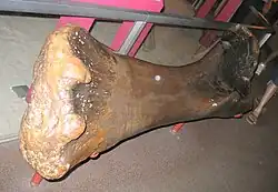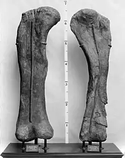 Distinguishing features can also be found in the ilium of the pelvis. In Brachiosaurus, the ischiadic peduncle, a downward projecting extension connecting to the ischium, reaches farther downward than in Giraffatitan. While the latter genus had a sharp notch between the ischiadic peduncle and the back portion of the ilium, this notch is more rounded in Brachiosaurus. On the upper surface of the hind part of the ilium, Brachiosaurus had a pronounced tubercle that is absent in other sauropods. Of the hindlimb, the femur was very similar to that of Giraffatitan although slightly more robust, and measured 203 centimeters (80 in) long.[4] As in Giraffatitan, it was strongly elliptical in cross section, being more than twice as wide in front or back view than in side view.[1] The fourth trochanter, a prominent bulge on the back side of the femoral shaft, was more prominent and located further downward. This bulge served as anchor point for the most important locomotory muscle, the caudofemoralis, which was situated in the tail and pulled the upper thigh backward when contracted. At the lower end of the femur, the pair of condyles did not extend backward as strongly as in Giraffatitan; the two condyles were similar in width in Brachiosaurus but unequal in Giraffatitan.[1]
