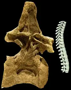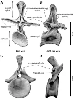 Though the vertebral column of the trunk or torso is incompletely known, the back of Brachiosaurus most likely comprised twelve dorsal vertebrae; this can be inferred from the complete dorsal vertebral column preserved in an unnamed brachiosaurid specimen, BMNH R5937.[72] Vertebrae of the front part of the dorsal column were slightly taller but much longer than those of the back part. This is in contrast to Giraffatitan, where the vertebrae at the front part were much taller but only slightly longer. The centra (vertebral bodies), the lower part of the vertebrae, were more elongated and roughly circular in cross section, while those of Giraffatitan were broader than tall. The foramina (small openings) on the sides of the centra, which allowed for the intrusion of air sacs, were larger than in Giraffatitan. The diapophyses (large projections extending sideways from the neural arch of the vertebrae) were horizontal, while those of Giraffatitan were inclined upward. At their ends, these projections articulated with the ribs; the articular surface was not distinctly triangular as in Giraffatitan. In side view, the upward-projecting neural spines stood vertically and were twice as wide at the base than at the top; those of Giraffatitan tilted backward and did not broaden at their base. When seen in front or back view, the neural spines widened toward their tops.[1]