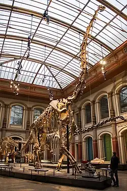 Preparation of the holotype began in the fall of 1900 shortly after it was collected by Riggs for the Field Museum. First the limb elements were processed. In the winter of 1904, the badly weathered vertebrae of the back and hip were prepared by James B. Abbott and C.T. Kline.[11] As the preparation of each bone was finished, it was put on display in a glass case in Hall 35 of the Fine Arts Palace of the Worlds Columbian Exposition, the Field Museum's first location. All the bones were, solitarily, still on display by 1908 in Hall 35 when the Field Museum's newly mounted Apatosaurus was unveiled, the very specimen Riggs had found in Quarry 12,[17] today catalogued as FMNH P25112 and identified as a Brontosaurus exemplar.[18] No mount of Brachiosaurus was attempted because only twenty percent of the skeleton had been recovered. In 1993, the holotype bones were molded and cast, and the missing bones were sculpted based on material of the related Brachiosaurus brancai (now Giraffatitan) in Museum für Naturkunde, Berlin. This plastic skeleton was mounted and, in 1994, put on display at the north end of Stanley Field Hall, the main exhibit hall of the Field Museum's current building. The real bones of the holotype were put on exhibit in two large glass cases at either end of the mounted cast. The mount stood until 1999, when it was moved to the B Concourse of United Airlines' Terminal One in O'Hare International Airport to make room for the museum's newly acquired Tyrannosaurus skeleton, "Sue".[19] At the same time, the Field Museum mounted a second plastic cast of the skeleton (designed for outside use) which was on display outside the museum on the NW terrace until 2022.[20][21]