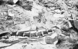 The holotype skeleton consists of the right humerus (upper arm bone), the right femur (thigh bone), the right ilium (a hip bone), the right coracoid (a shoulder bone), the sacrum (fused vertebrae of the hip), the last seven thoracic (trunk) and two caudal (tail) vertebrae, and several ribs.[4][1][15] Riggs described the coracoid as from the left side of the body,[4][11][15] but restudy has shown it to be a right coracoid.[1] At the time of discovery, the lower end of the humerus, the underside of the sacrum, the ilium and the preserved caudal vertebrae were exposed to the air and thus partly damaged by weathering. The vertebrae were only slightly shifted out of their original anatomical position; they were found with their top sides directed downward. The ribs, humerus, and coracoid, however, were displaced to the left side of the vertebral column, indicating transportation by a water current. This is further evidenced by an isolated ilium of Diplodocus that apparently had drifted against the vertebral column, as well as by a change in composition of the surrounding rocks. While the specimen itself was embedded in fine-grained clay, indicating low-energy conditions at the time of deposition, it was cut off at the seventh presacral vertebra by a thick layer of much coarser sediments consisting of pebbles at its base and sandstone further up, indicating deposition under stronger currents. Based on this evidence, Riggs in 1904 suggested that the missing front part of the skeleton was washed away by a water current, while the hind part was already covered by sediment and thus got preserved.[11]