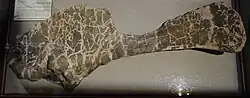 Several additional specimens were briefly described by Jensen in 1987.[23] One of these finds, the humerus USNM 21903, was discovered in ca. 1943 by uranium prospectors Vivian and Daniel Jones in the Potter Creek Quarry in western Colorado, and donated to the Smithsonian Institution. Originally, this humerus was part of a poorly preserved partial skeleton that was not collected.[1][23][38] According to Taylor in 2009, it is not clearly referable to Brachiosaurus despite its large size of 2.13 meters (6 ft 11+3⁄4 in). Jensen himself worked at the Potter Creek site in 1971 and 1975, excavating the disarticulated specimen BYU 4744, which contains a mid-dorsal vertebra, an incomplete left ilium, a left radius and a right metacarpal. According to Taylor in 2009, this specimen can be confidently referred to B. altithorax, as far as it is overlapping with its type specimen. Jensen further mentioned a specimen discovered near Jensen, Utah, that includes a rib 2.75 meters (9 ft 1⁄4 in) in length, an anterior cervical vertebra, part of a scapula, and a coracoid, although he did not provide a description.[1][23] In 2001, Curtice and Stadtman ascribed two articulated dorsal vertebrae (specimen BYU 13023) from Dry Mesa Quarry to Brachiosaurus.[25] Taylor, in 2009, noted that these vertebrae are markedly shorter than those of the B. altithorax holotype, although otherwise being similar.[1]