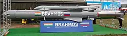 The BrahMos (also designated as PJ-10)[14] is a long-range,[15] ramjet-powered supersonic cruise missile that can be launched from submarines, ships, fighter aircraft or TEL.[16] It is a joint venture between India's Defence Research and Development Organisation (DRDO) and the Russian Federation's NPO Mashinostroyeniya, who together have formed BrahMos Aerospace.[17] The missile is based on P-800 Oniks.[18][19] The name BrahMos is a portmanteau formed from the names of two rivers, the Brahmaputra of India and the Moskva of Russia.