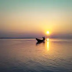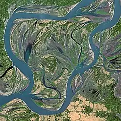 The Ganga Delta, fed by the waters of numerous rivers, including the Ganga and Brahmaputra, is 105,000 km2 (41,000 mi2), one of the largest river deltas in the world.[16]